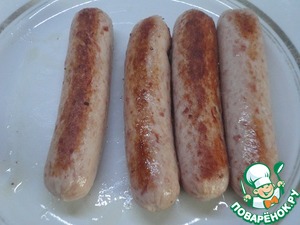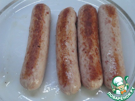 Сосиски обжарить до румяности. Включите духовку для разогрева на 160-180С.