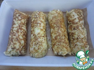 Выкладываем "блинчик" на тарелку посыпаем 1/4 частью натертого сыра, выкладываем 1 сосиску и аккуратно заворачиваем ее в этот "блинчик".