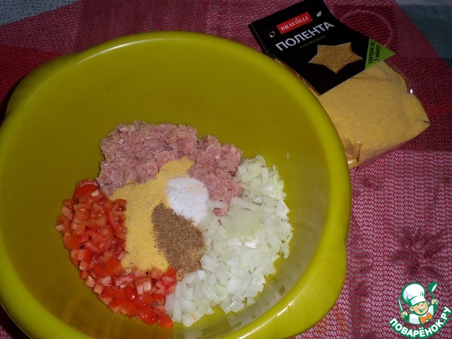 В миску выкладываем мясной фарш, нарезанный лук, помидоры и кукурузную поленту. Добавляем соль и смесь перцев.