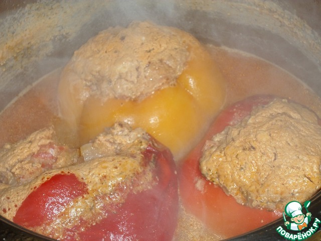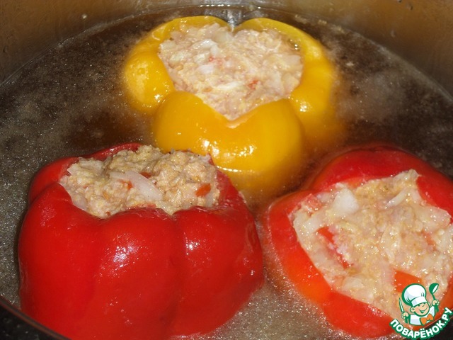 Кастрюлю ставим на огонь. Выкладываем в нее фаршированные перцы.