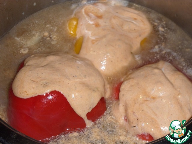 Подготовленный соус выкладываем поверх перцев. Доводим содержимое кастрюли до кипения. Убавляем огонь до среднего значения, прикрываем кастрюлю крышкой и готовим перцы в течении 30 минут.