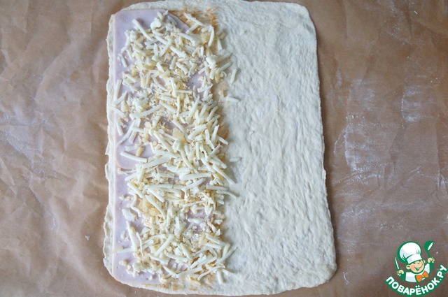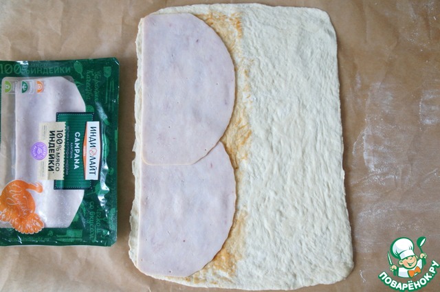 Кусок теста раскатать, смазать половину теста любым соусом и положить ломтики ветчины. Я делала и с сырным соусом, и со сметанно-чесночным, и с барбекю.