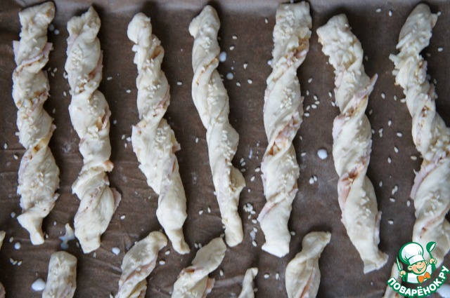 Выложить на противень, смазать молоком и присыпать кунжутом.
