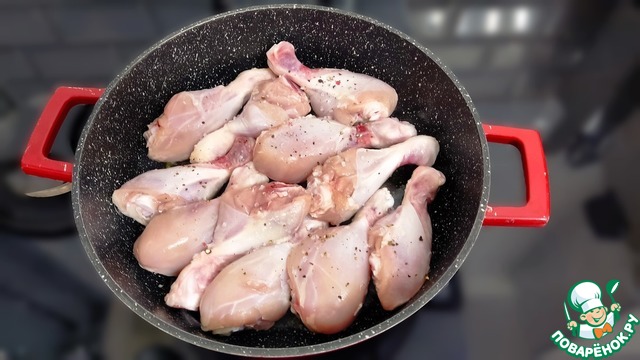 Разогреть сковороду с растительным маслом и выложить куриные голени, посолить и поперчить по вкусу, обжарить курицу на средней температуре 2-3 минуты на среднем огне до золотистой корочки, Перевернуть посолить поперчить 2-3 минуты до золотистой корочки.