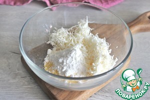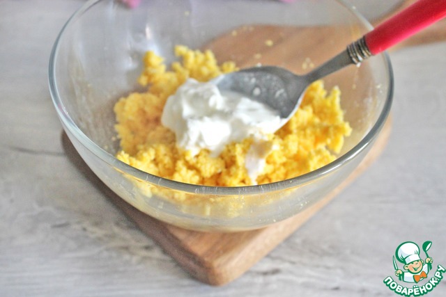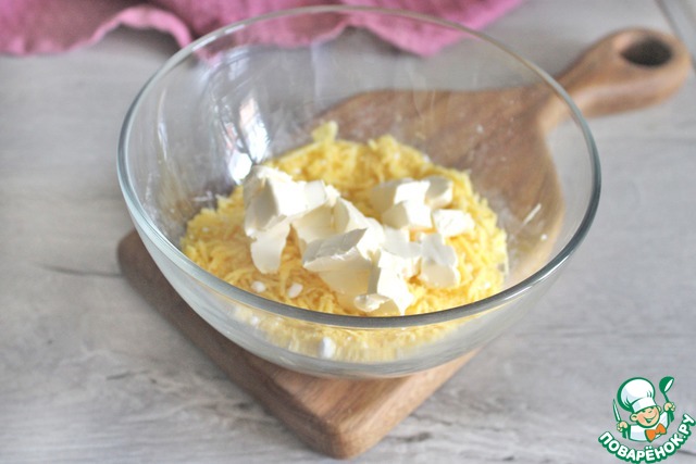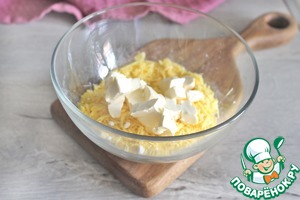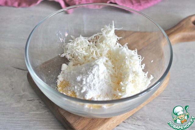 Добавить натертый на мелкой терке копченый колбасный сыр, сахарную пудру, соль, хорошо перемешать.