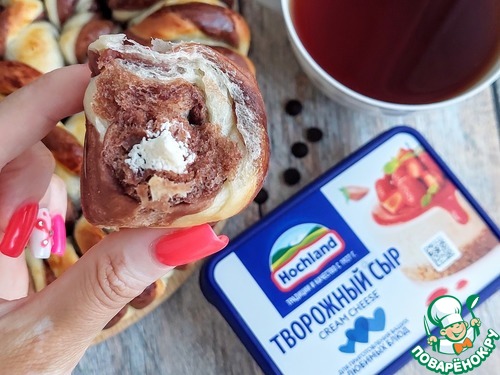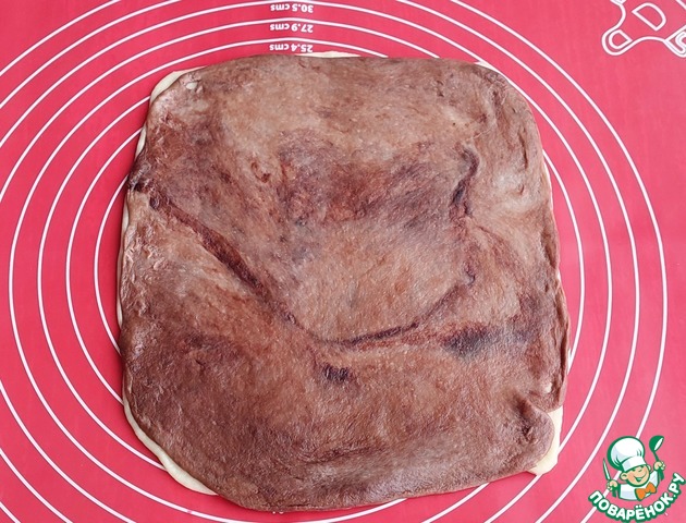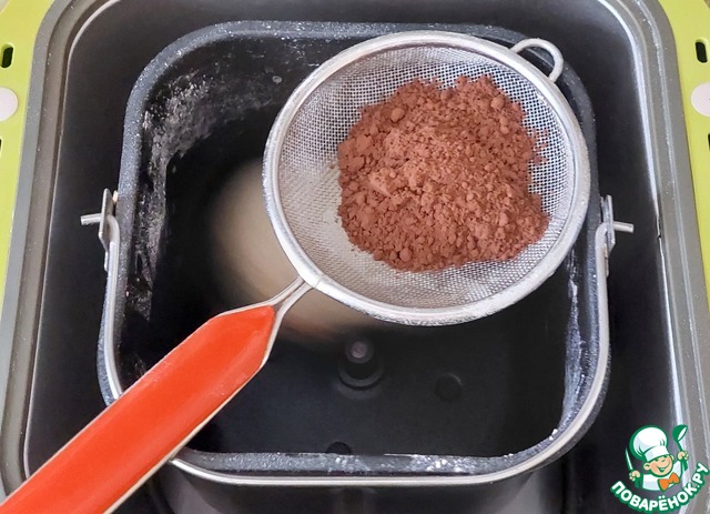 Одну из частей снова вернуть в хлебопечку, просеять какао и поставить на замес.