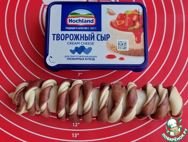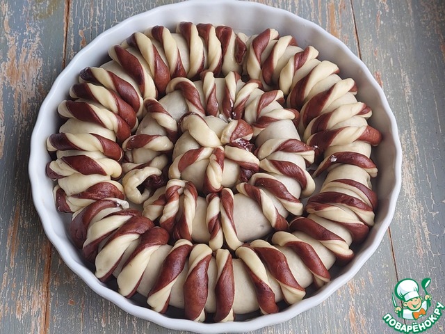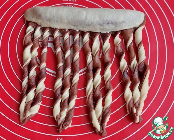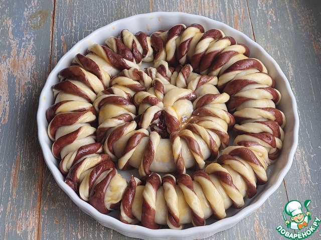 Белую и шоколадную часть теста разделить на 4 кусочка.