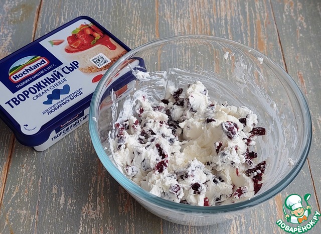 Смешать в миске творожный сыр, сахарную пудру и клюкву.