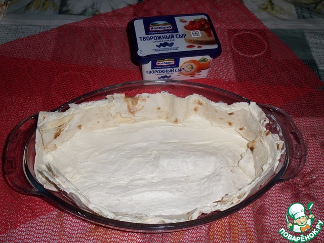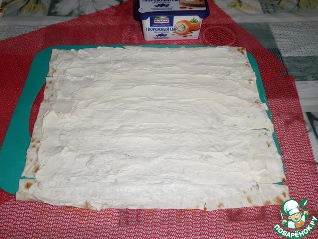 От листа лаваша отрезать небольшой кусочек. Оставшийся большой лист смазываем творожным сыром.