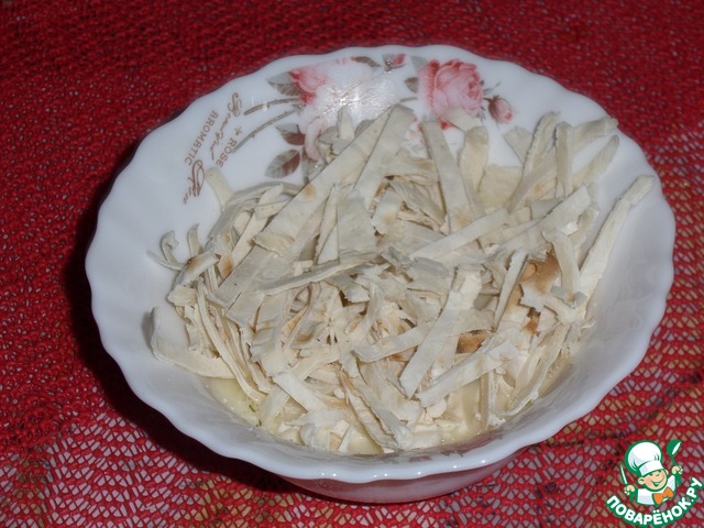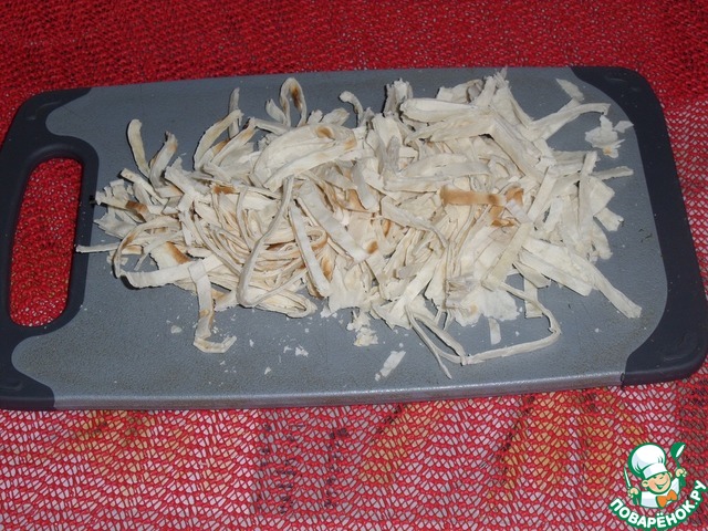 Отложенный небольшой кусочек лаваша нарезаем соломкой.