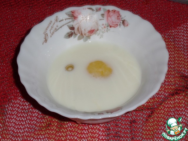 В небольшую миску разбиваем яйцо. Вливаем молоко. Солим по вкусу. Хорошо взбиваем смесь.