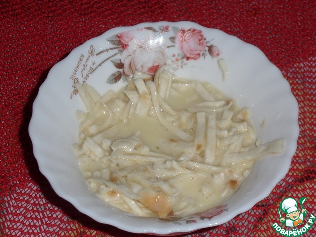 Соломку из лаваша выкладываем в миску с яичной смесью.