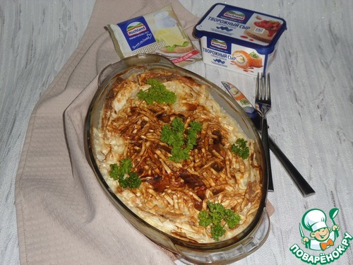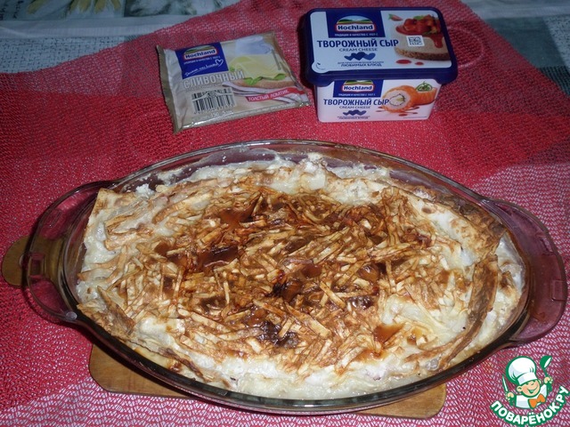 Выкладываем эту массу поверх мясного фарша и равномерно распределяем.