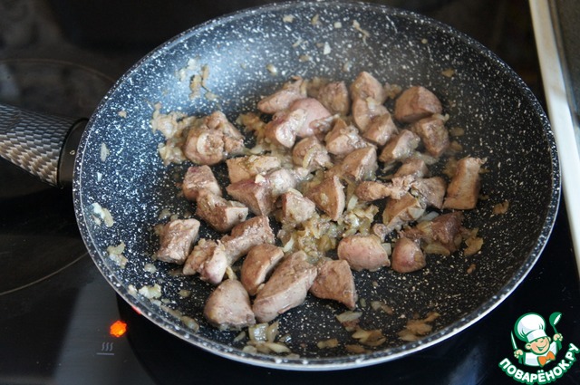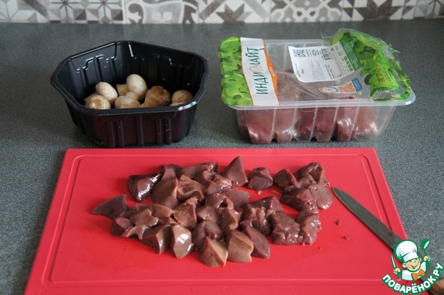 В начинку добавить грибы. У меня были замороженные мини-шампиньоны, я проварила их в подсоленной воде около 1 минуты. Свежие грибы можно обжарить вместе с печенью.