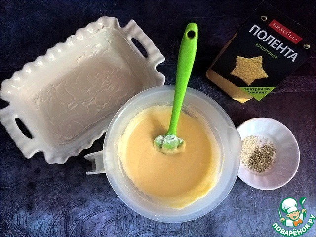 В посуду наливаем сыворотку. Я взяла сыворотку из-под сыра моцареллы. Можно взять любую. Я ещё использую иногда из-под рассольной брынзы. Добавляем соду и ждём реакцию на кислую среду. У яйца нужно отделить желток, он только понадобится. Кладём соль и сахар. Масло сливочное растопила в СВЧ 35 секунд при мощности 800. Растопите любым доступным способом. Отправляем его в посуду и всё вымешиваем. Я использую силиконовую лопатку. Сыплем поленту и хорошенько размешиваем. Пусть постоит смесь минут 10, чтобы полента впитала жидкость.