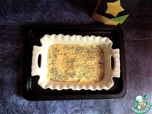 Выкладываем тесто. Аккуратно разравниваем его силиконовой лопаткой. Присыпаем сверху орегано смешанным с кунжутом. Ставим в духовку, выставив Т-180 С и время 40 минут.