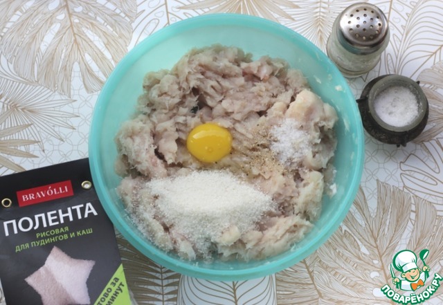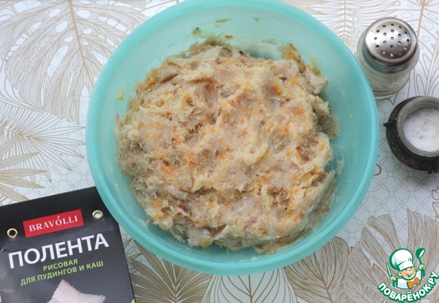 Рыбу нарезать на кусочки и пропустить ч/з мясорубку или пробить в чаще блендером. Добавить в рыбный фарш рисовую поленту ТМ Bravolli, яйцо, соль, перец, обжаренные лук с морковью или просто нарезанную луковицу.