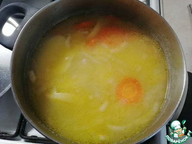В готовый бульон добавить нарезанный картофель, после закипания положить обжаренные морковь с луком. Добавить по вкусу соль и любимые специи