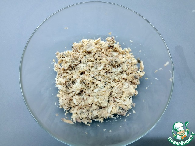Для начинки открыть консервную банку, достать кусочки горбуши. Убрать косточки и кожу. Мелко измельчить вилкой.
