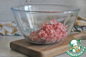 Приготовить начинку для голубцов. Для этого в чашку выложить фарш.