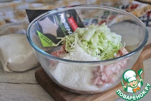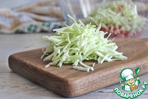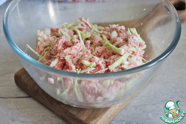 Капусту нарезать тоненькой соломкой, добавить в чашку с фаршем.