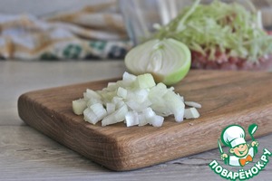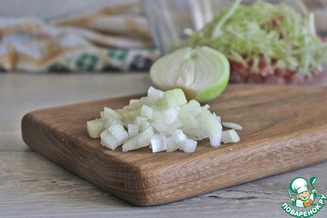 Репчатый лук очистить, сполоснуть холодной водой, мелко нарезать, добавить в чашку с фаршем и капустой.