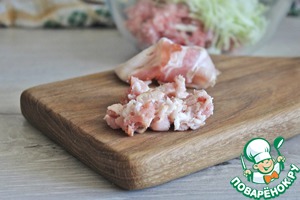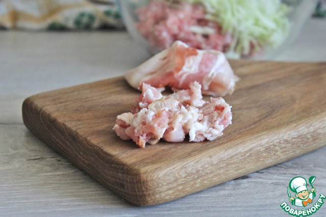 Бекон нарезать небольшими кусочками, добавить в чашку с остальными ингредиентами для начинки для голубцов.