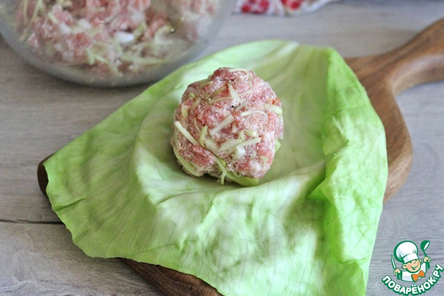 Взять порцию начинки около 80 грамм, придать ей форму шара. Поместить начинку в серединку капустного листа.