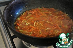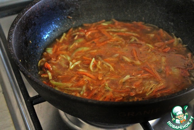 Приготовь подливку для голубцов. Для этого на сковороде растопить сливочное масло, добавив растительное, но котором обжарить до мягкости натертую соломкой морковь, нарезанный полукольцами репчатый лук и нашинкованную соломкой капусту, затем добавить кетчуп, влить бульон, посолить, приправить по вкусу и томить 10 минут.