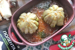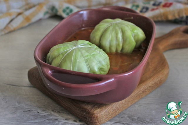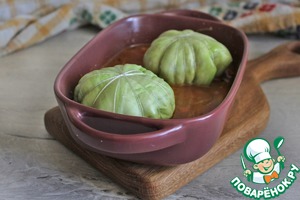 Приготовленную подливу вылить в форму для запекания, уложить голубцы, накрыть фольгой и запекать в духовке при 180 градусах около 1,5 часов.