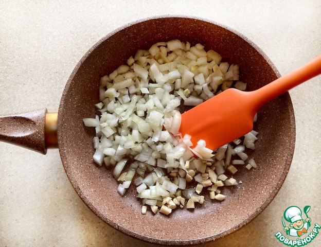 Для начала на растительном масле пассируйте измельчённый лук и чеснок до золотистого цвета.