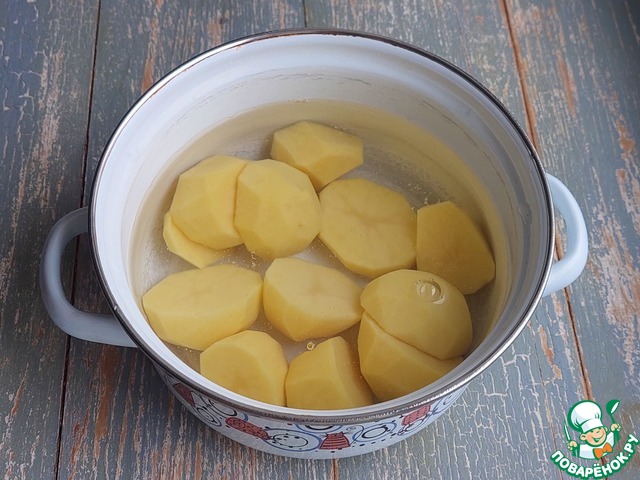 Картофель почистить, помыть, переложить в кастрюльку, залить водой, добавить соль и отварить до готовности.