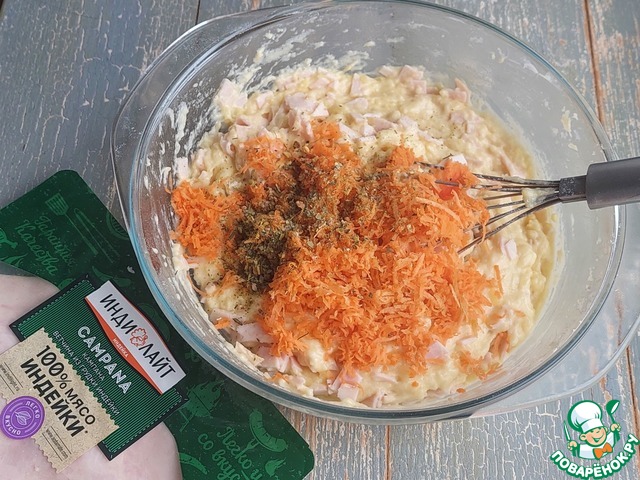 Морковь почистить, помыть, натереть на мелкой тёрке, добавить в миску вместе со специями (у меня средиземноморские).