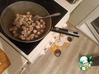 Выкладываем на сковородку мясо и жарим на почти сильном огне до лёгкого золотистого цвета. У меня ушло 3-5 минут (кошка забыла время засечь). -