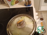 Накрываем наше блюдо этими листьями, закрываем сковородку крышкой и тушим около 15-20 минут. Периодически проверяем, чтоб ни чего не пригорело, чтоб была жидкость. По немногу перемешиваем - я приоткрывал один листик капусты мешал, потом приоткрывал второй. Лучше использовать вилку и ложку (с одной ложкой - я все пальцы обжог))) -