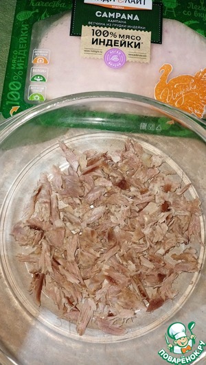 Свинину отварить, остудить и порезать мелкими кусочками.