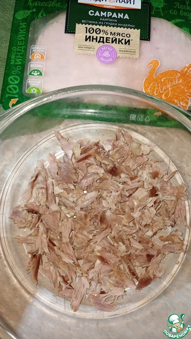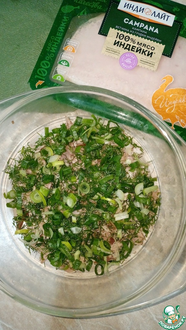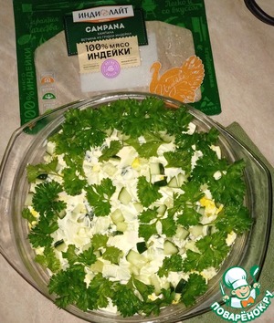Наш любимый салат для сытного перекуса всей семьи. Хрустящие огурчики и зелень прекрасно сочетаются в нём с ветчиной из индейки. Подойдет для ужина или семейного праздника.