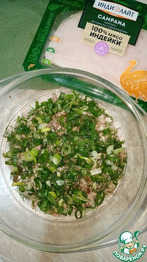 Сверху, режем мелко зелёный лук и укроп и кладём на слой мяса свинины- слой зелени, присаливаем по вкусу, поливаем тонким слоем майонеза.