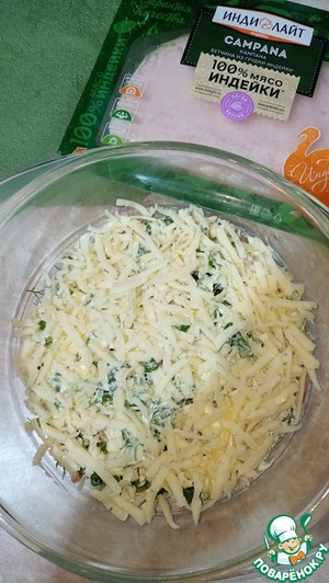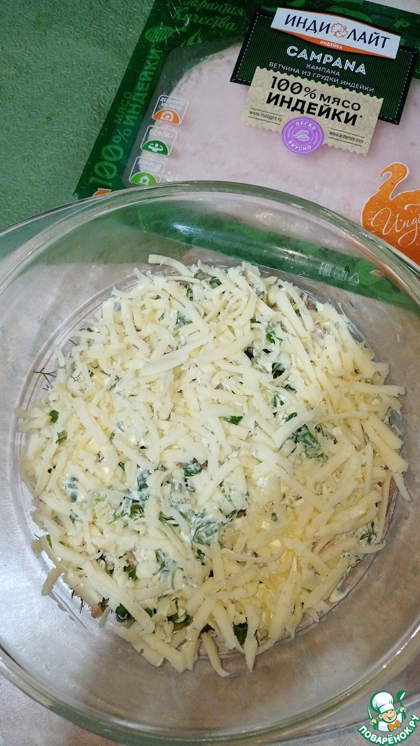 Небольшой кусочек сыра трём на крупной тёрке и кладём на зелень, майонез не надо.