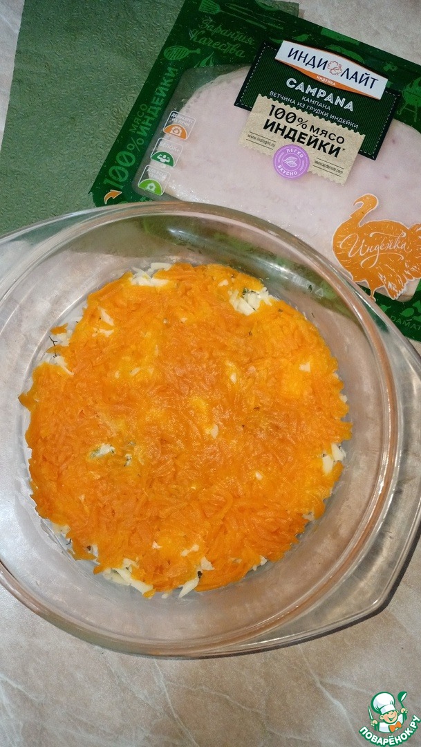 Дальше на сыр добавляем морковь вареную и остуженную, натёртую на крупной тёрке, смазываем майонезом.
