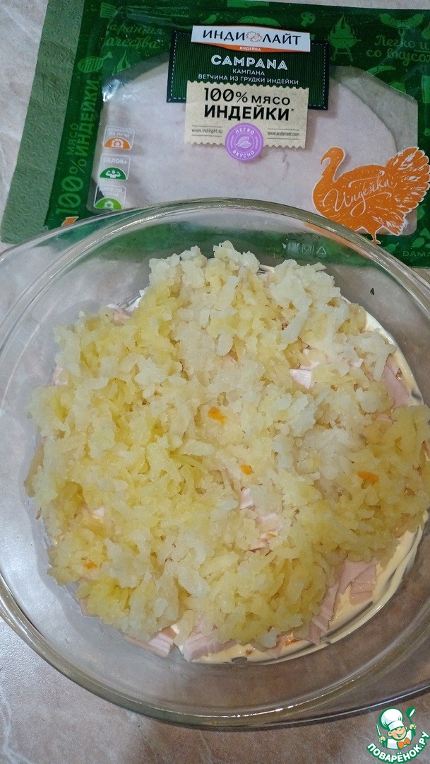 На ветчину выкладываем натёртую картошку, вареную и остуженную, майонезом смазываем.