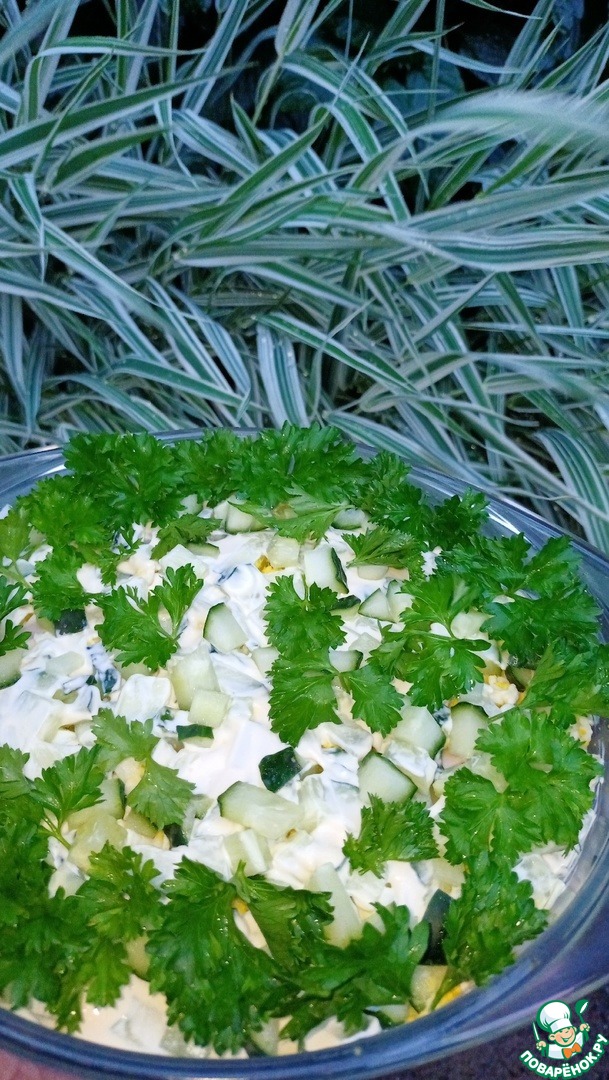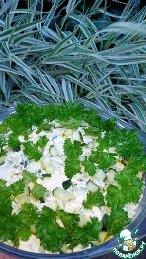Сверху порезанный кубиками свежий огурец, огурец присаливаем. И украшаем верх порезанной петрушкой.
