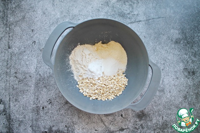 В миску насыпьте манку, сахар, овсяные хлопья, муку, разрыхлитель и ванильный сахар.