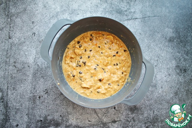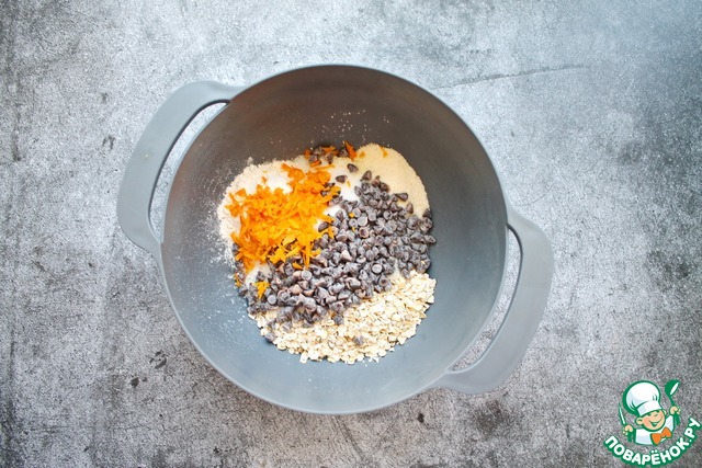 Добавьте к сухим ингредиентам шоколад, я использовала шоколадные капли, мелко резаную цедру с 1/4 апельсина.
