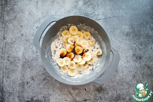 Банан почистите и порежьте колечками, добавьте в миску с массой и влейте кленовый сироп.