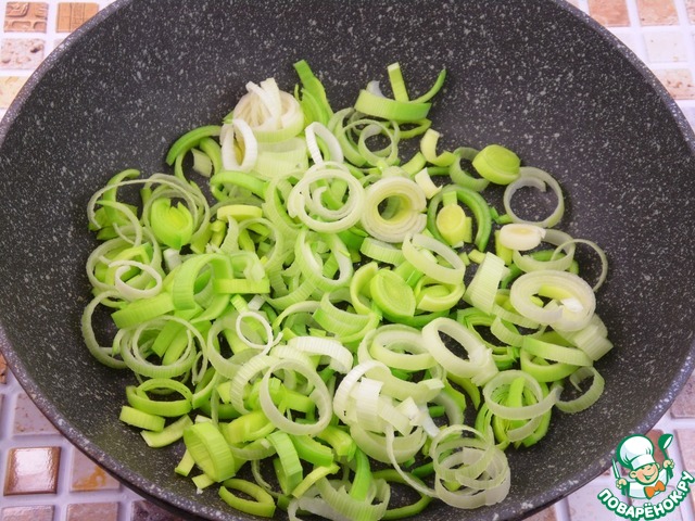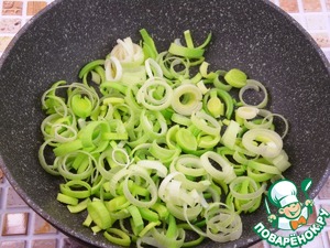 В сковородку налить растительное масло. Немного прогреть, выложить в него нарезанный колечками лук-порей. Обжарить 3-4 минуты.