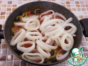 В подготовленный соус выложить заранее размороженные кольца кальмаров. Тушить все вместе 5 минут.
