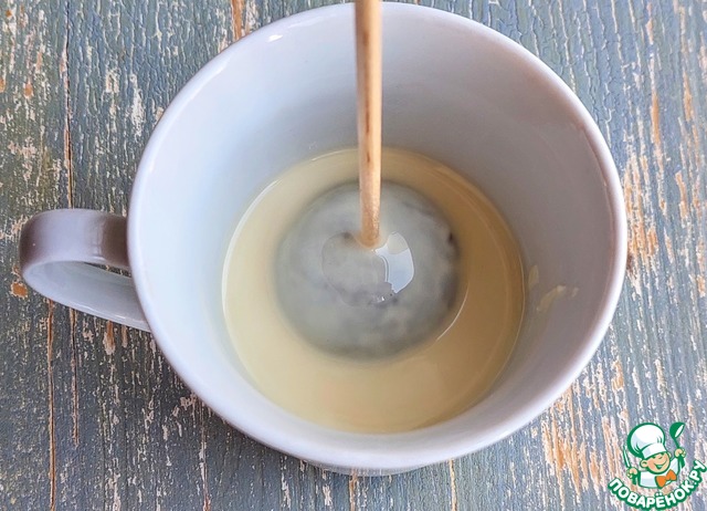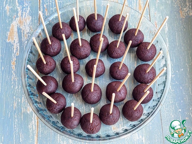 Скатываем 25 шариков, величиной чуть больше грецкого ореха. В каждый шарик воткнуть шпажку и убираем в морозильную камеру на 30 мин. За это время шарики стабилизируются и не будут разваливаться, сползать со шпажки. И будет лучше застывать глазурь.