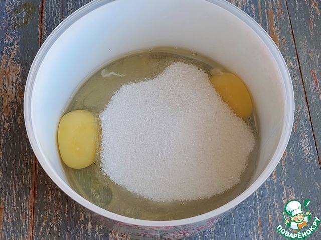 В емкость вбить яйца, высыпать сахар. Взбить миксером до пышной пены.