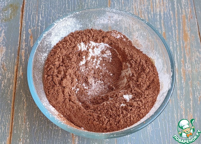 Затем просеять муку, соль, разрыхлитель теста и какао-порошок.